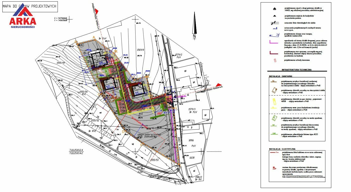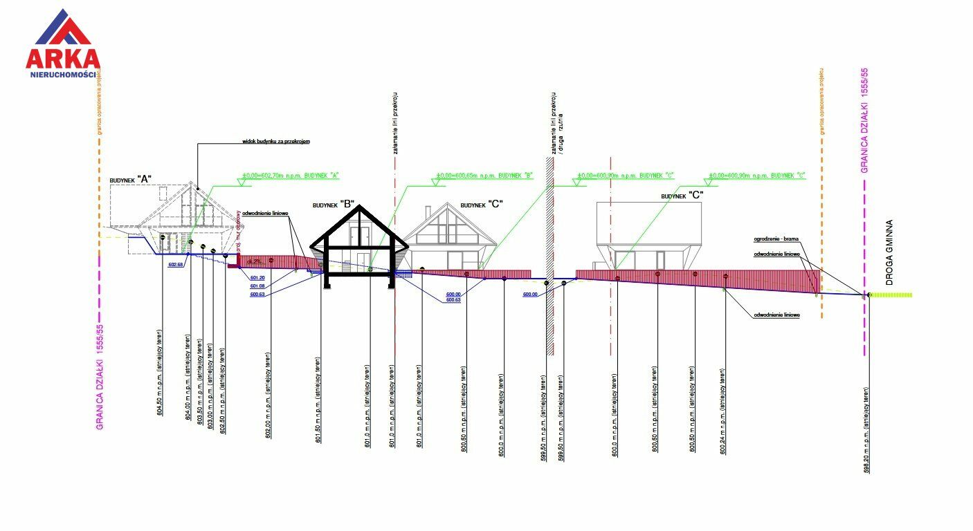 Teren jest nachylony w kierunku południowo-wschodnim, co sprzyja nasłonecznieniu i atrakcyjnej ekspozycji budynków.
